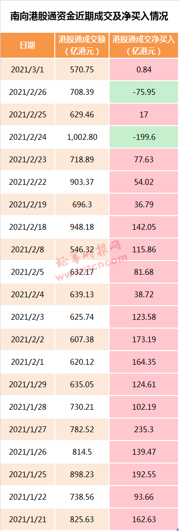 数据显示,在2月24日当天港股通净卖出199.60亿港元,这一净卖出额为史上最高。次日港股通重拾净买入,净买入17亿港元。不过到了2月26日,港股通再次大幅净卖出75.95亿港元。总的来看,短短几天时间里,港股通资金合计净卖出超过200亿港元。