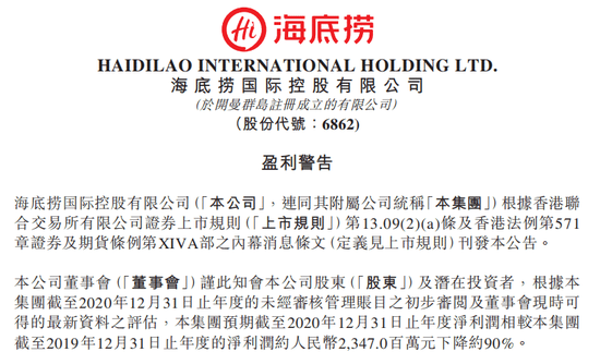 3月1日消息,海底捞发布盈利警告,表示2020年年度净利润相较2019年下降约90%。