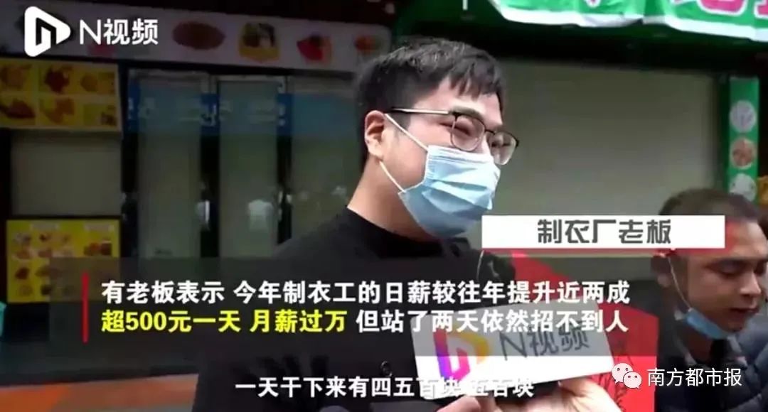 有制衣厂老板甚至表示,今年制衣工的日薪较往年提升近两成,超500元一天,“月薪过万很正常”,但站了两天依然招不到人。