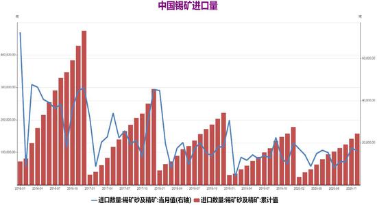 中国海关数据显示,海关数据显示,12月份锡矿砂及精矿进口量16162吨,环比下降7.82%,同比减少19.12%;2020年全年累计进口15.81万吨,累计同比减少11.27%。2020年我国锡矿供应进一步下降,一方面由于中缅口岸锡矿运输依然缓慢,另一方面由于缅甸锡矿开采技术落后,破坏性开采使得资源面临枯竭,2017年以来缅甸锡矿进口量便持续下行。进入2月份,由于缅甸政治局势突变,当地矿场存在罢工的可能性,使得锡矿供应前景存在较大不确定性,加之国内银漫矿业因员工猝死事故停产自查,锡矿供应紧张局面进一步升温。