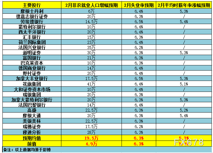 北京时间周五(3月5日)21:30将公布美国2月季调后非农就业人口变动和失业率,周三(3月3日)包括摩根士丹利(MorganStanley)在内的24家大型投行发表了对此次数据的前瞻,具体如下。