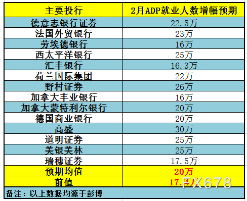 北京时间周三21:15将公布美国2月ADP就业人数,该数据素有“小非农”之称,包括德意志银行在内的11家大型投行发表了对12月ADP就业人数增幅的前瞻,具体如下: