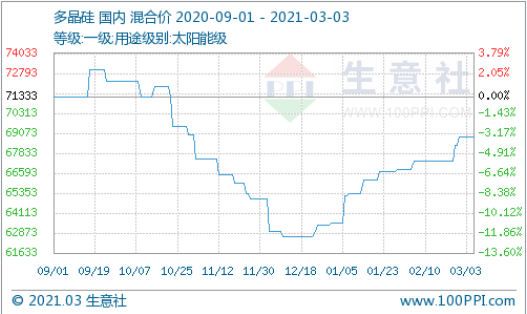 今年以来,多晶硅价格再度持续走强,涨至6.9万/吨附近。