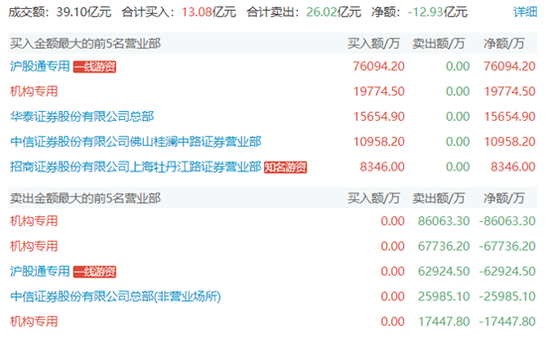 盘后龙虎榜显示,资金出逃明显,全天净卖出12.93亿。其中机构合计卖出15.14亿;北向资金买入7.61亿,卖出 6.29亿,合计卖出1.32亿。