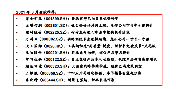 2月券商金股组合收益排名第一东兴证券,推荐的3月份十大金股为紫金矿业、龙蟒佰利、濮耐股份、万科A、天工国际、生物股份、智飞生物、瀚蓝环境、五粮液、吉比特。