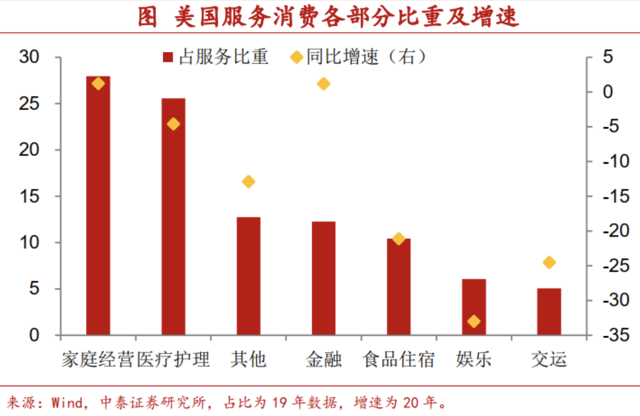 金融地产领衔,交运娱乐垫底。从美国服务业的各个子行业来看,金融和地产相关行业恢复较快,2020年基本已经恢复到了疫情之前的水平,而娱乐、食品住宿和交运行业恢复情况不佳,2020年仅恢复到2019年的不到八成水平,这三者占美国服务消费的比重超过五分之一。
