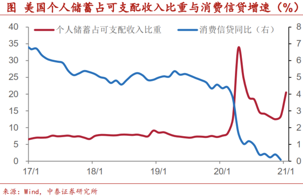 其次,居民消费意愿在疫情期间有比较明显的下降,这固然和很多消费场景未能实现有关,但也反映出人们预防性储蓄需求的上升,减少债务负担成为多数人的选择。而在疫情真正得到控制后,消费意愿能够以多快的速度回升,事实上还有待观察。一方面,居民的商品消费需求可能已经趋于饱和,疫情好转后或将面临消费结构的转换,而并非总量的快速增长;另一方面,在美国疫情相对缓和的时期,比如交运恢复较快的去年二季度末三季度初,个人储蓄占可支配收入比重仍然超过了12%,远高于疫情前的个位数水平。