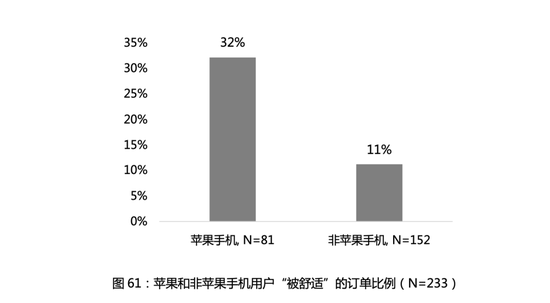 在进行的233次实验中,iPhone用户被派单舒适型车辆的概率为32%,而非iPhone用户被派舒适型单的概率仅为11%,舒适性车辆费用通常更高。如用户使用的不是iPhone时,则根据手机价位,价位越贵的手机越有可能被派舒适型的单。