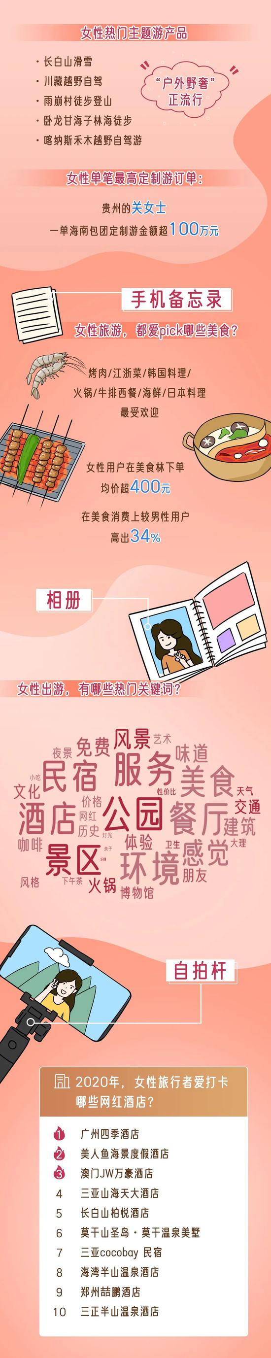 女性用户出游更爱“晒”:服务、环境、美食、体验、文化、交通等,都是“她旅途”中的热门关键词。在携程社区,高赞攻略多来源于为女性旅行者的分享,其中“网红打卡地”类的攻略最受欢迎。携程社区2020年带“网红”关键词的热门攻略中,在广州四季酒店高空云端喝下午茶、在美人鱼海景度假酒店的洱海边发发呆、在澳门JW万豪酒店体验“极度舒适”、在三亚山海天大酒店打卡临海泳池……无论哪一种姿势,都能让女性体验到旅行带来的治愈。