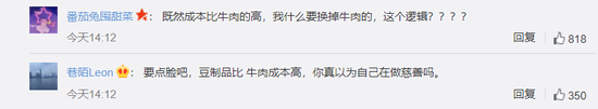 然而对这一说法,网友仍不买账。有网友表示,“既然成本比牛肉的高,为什么要换掉牛肉的,这个逻辑?”“以为自己在做慈善吗?”