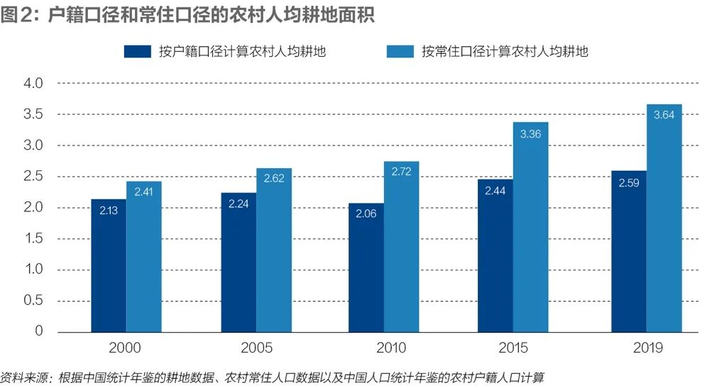 首先是至少有2.8亿的农村人口已经脱离农业,实现了非农就业,甚至被统计为城镇常住人口。如果按常住口径来统计,由于农村减少了2.8亿常住人口,所以也使得农村人均占有资源水平有了一定的提高,具体来说,从2000年的人均耕地2.41亩提高到现在的3.64亩耕地(图2)。
