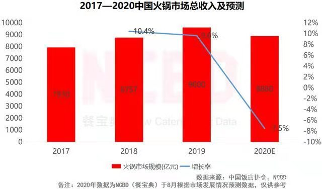 根据NCBD(餐宝典)数据可知,2020年1至1月餐饮行业整体规模达到34578亿元,而火锅市场总收入将达到8880亿元。