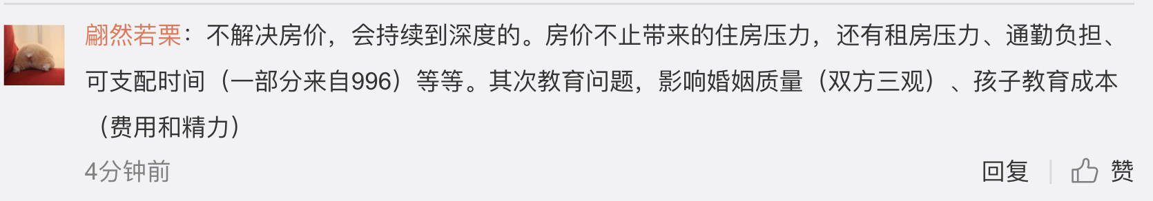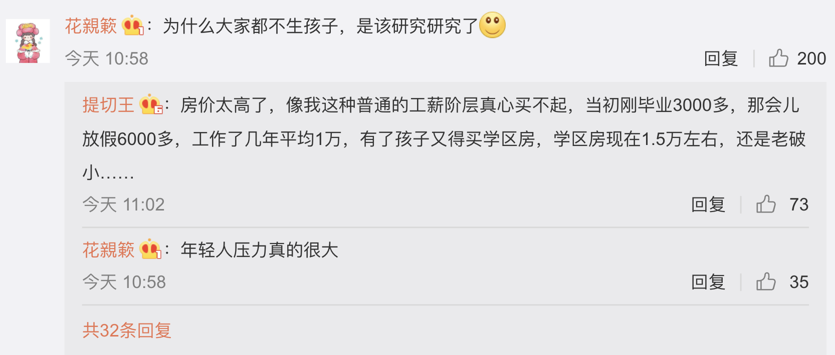 此外,网友们也就“为什么大家不愿生孩子了”这一问题展开了讨论,房价、教育等问题带来的生活压力是最常被提及的原因。