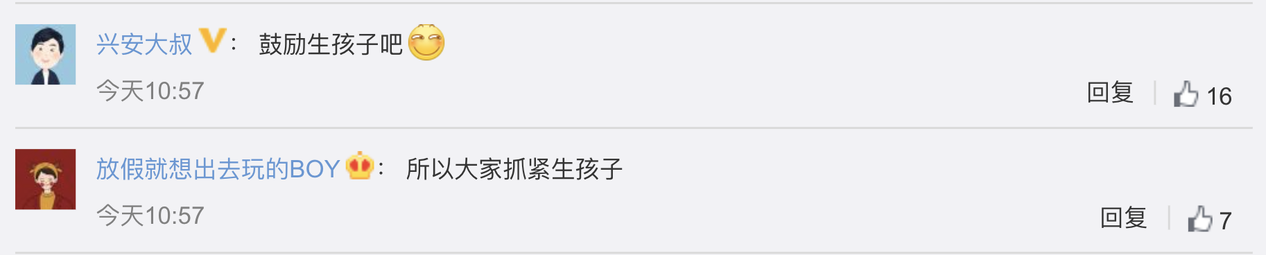另一部分网友则认为,人口老龄化问题还需要靠提高生育率解决:“所以大家抓紧生孩子。”