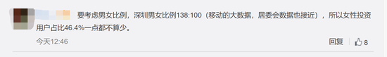 也有网友对影响数据分析的因素提出质疑,表示“要考虑男女比例,深圳男女比例138:100(移动的大数据,居委会数据也接近),所以女性投资用户占比46.4%一点都不算少。”