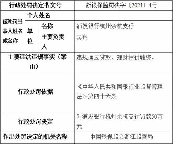 一波未平一波又起,就在2月3日,银保监会又对浦发银行开出了罚单。因“违规通过贷款、理财提供融资”,浦发银行杭州余杭支行被浙江银保监局罚款50万元。