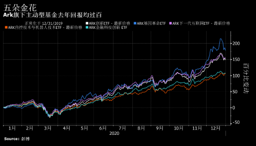 今年1月中旬,Ark跻身ETF行业十大发行人之列,2月中旬时资管规模从一年前的30多亿美元增长至600多亿美元。Ark旗下五只主动型ETF的2020年回报均超100%,其中旗舰基金ARKK的回报将近150%。ARKK还击败摩根大通的超短收益ETF(JPST),成为规模排名全球第一的主动型基金。