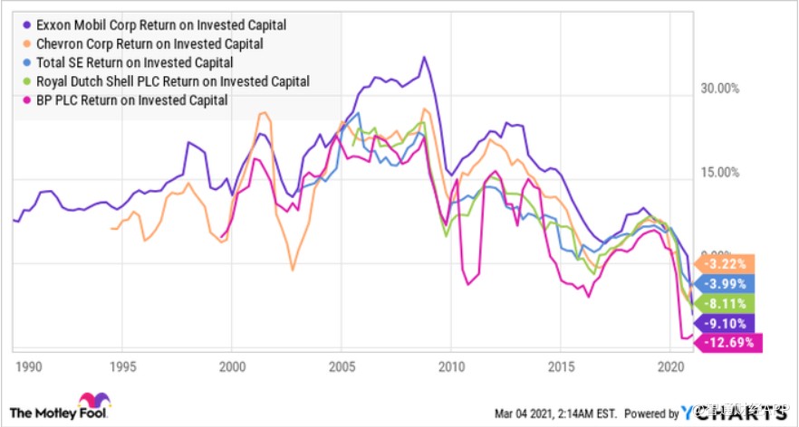 除了严峻的市场环境之外,埃克森美孚面临的困境部分归因于管理方面的失误。正如上图所示,埃克森美孚的投资资本回报率多年来一直处于行业领先水平,而去年却急剧下降。为响应投资者的要求,该公司今年已增加了三名新董事。