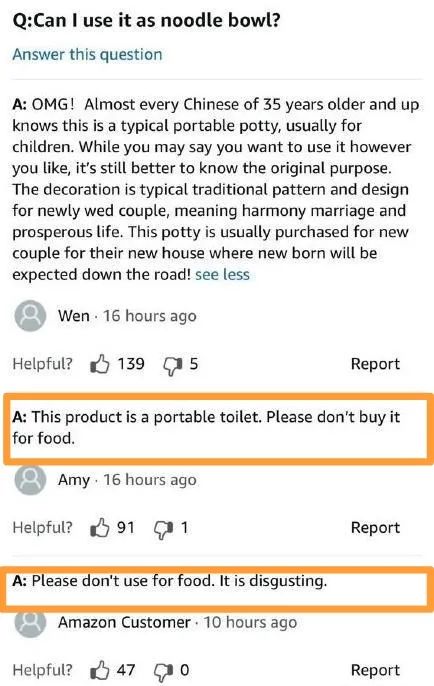 目前在美亚官网上,虽仍有零星几家店铺在售,其中一家显示剩余库存18件。一用户问此产品的功能,店家不忘补充道:“用途多样,可用作器物装日用品,也可当作垃圾桶和便盆”。不过也有某些明白人好心奉劝:“这是尿桶,别用来装食物!”