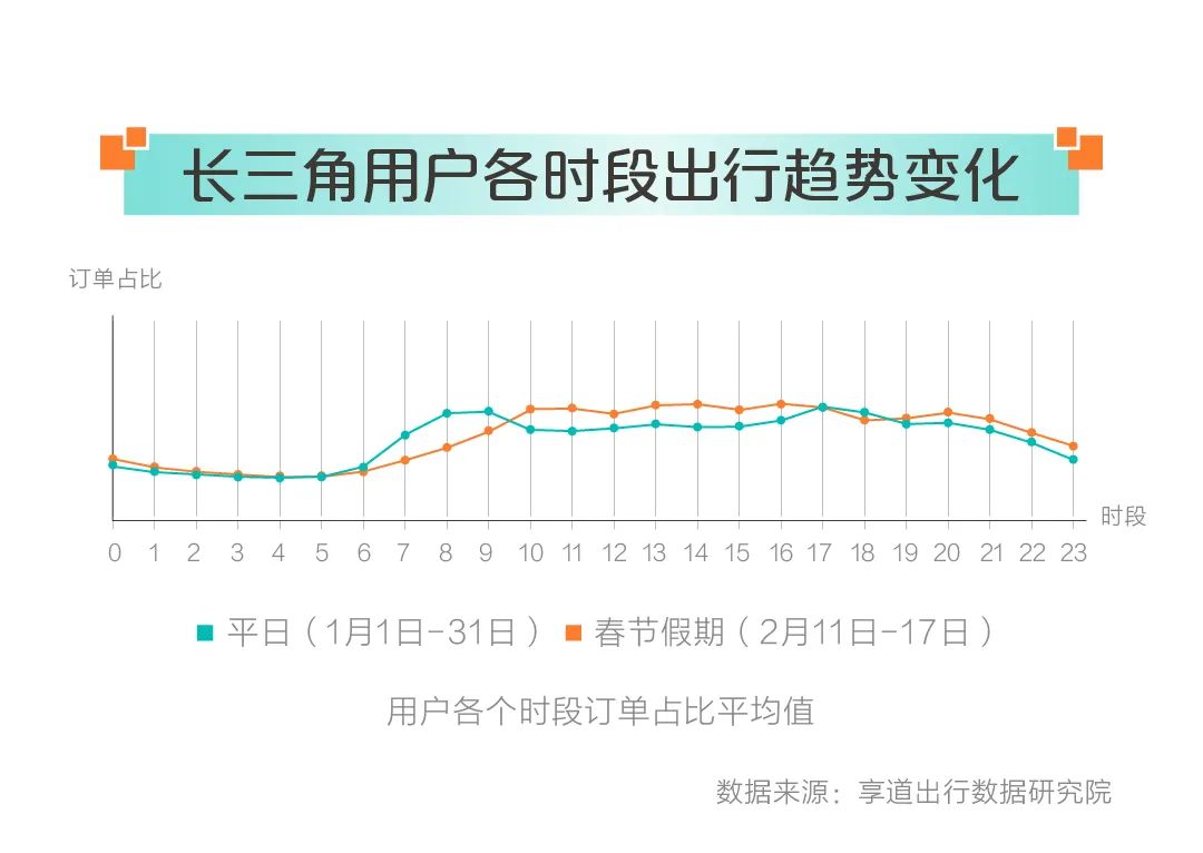 以往一到春节就唱“空城计”的城市,则出现了早高峰延迟、“夜猫子”变多的现象。享道出行提供给出行一客(ID:carcaijing)的数据显示,长三角地区春节期间早高峰由平日的早上7点-9点推迟,10点才迎来出行高峰,并且在20点迎来第二个高峰,夜间订单占比也高于平时。这表明,春节期间,人们外出时间主要集中在中午或下午,而且夜间出行更频繁,夜生活更活跃。