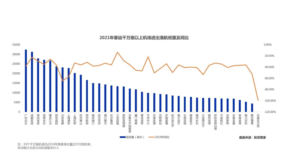 从地理上看,北京和上海的降幅非常明显。航班管家提供给出行一客(ID:carcaijing)的数据显示,春运期间进出港航班最多的机场分别是广州白云机场、成都双流机场和深圳宝安机场,而作为往年前两名的北京首都机场和上海浦东机场,在2021年已经排到了第7和第8的位置,甚至逊于西安和昆明,可见降幅之大。