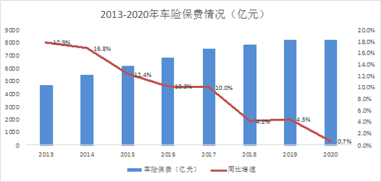 “A智慧保”统计了2013-2020年的车险保费数据发现,其实车险保费增速的下降,近年来早已出现。
