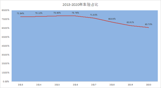 数据显示,2013-2020年期间,车险在财险市场中的占比从70%以上降至2020年的60.7%,下降了近14个百分点。2021年1月,跌破50%的占比,可以说是车险历史上的一大转折。