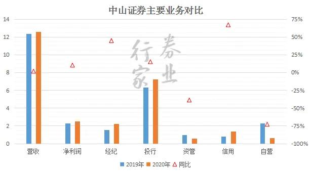 纵向来看,中山证券未能复刻上一年的高速增长。据2019年年报披露,中山证券当期营收同比增长34.12%,归母净利润的同比增速高达239.98%。
