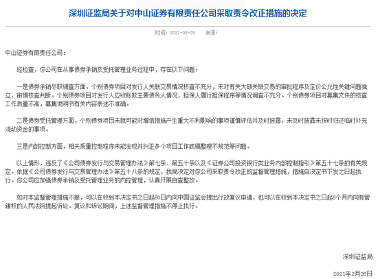 为此,深圳证监局对中山证券采取责令改正的监管措施,要求其加强债券承销及受托管理业务的内控管理,认真开展自查整改。