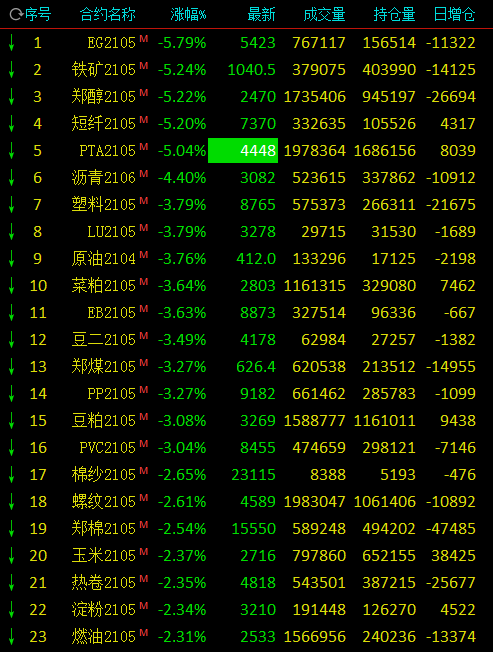 热点栏目3月10日,国内期市多数品种收跌,能化品与黑色系跌幅居前,乙二醇、甲醇、短纤跌逾5%,PTA跌停,沥青跌逾4%,原油跌近4%;铁矿石跌逾5%,动力煤跌逾3%,20号胶涨逾3%,焦煤涨近2%。农产品中,鸡蛋涨逾2%,菜粕、豆二、豆粕跌逾3%。