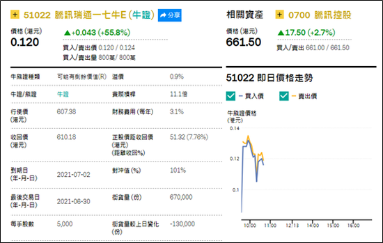 腾讯控股(0700.HK)周二微升0.23%,收报644港元。腾讯自2月高位已回吐接近20%,昨日于100天线附近觅得支撑,短线技术指标有所好转;今早高开逾4%,挑战50天线,及后回吐部分涨幅,于60天线上方争持。此外,腾讯亦获机构看好,上调目标价至820港元,估值重新变得吸引。做看多部署,可留意腾讯牛证51022,收回价610.18港元,换股比率为500:1,杠杆比率约11.1倍;亦可留意其认购证15069,行使价720.00港元,换股比率为100:1,今年5月3日到期。看淡操作,可留意腾讯熊证56681,收回价728.80港元,换股比率为500:1,杠杆比率约8.4倍;或腾讯认沽证20153,行使价566.28港元,换股比率为100:1,今年6月28日到期,投资者可视乎自身风险承担能力理性选择。