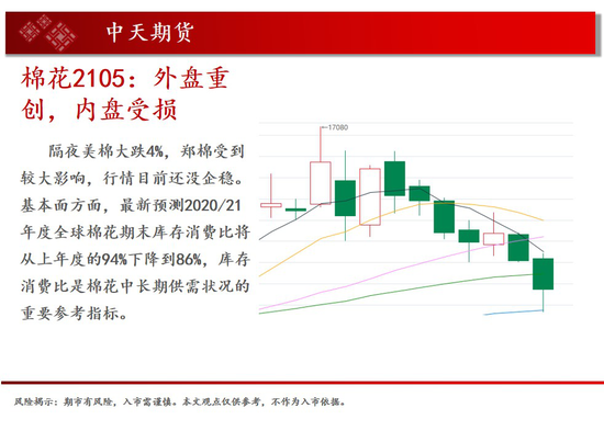 基本面概述:基本面方面,最新预测2020/21年度全球棉花期末库存消费比将从上年度的94%下降到86%,库存消费比是棉花中长期供需状况的重要参考指标。