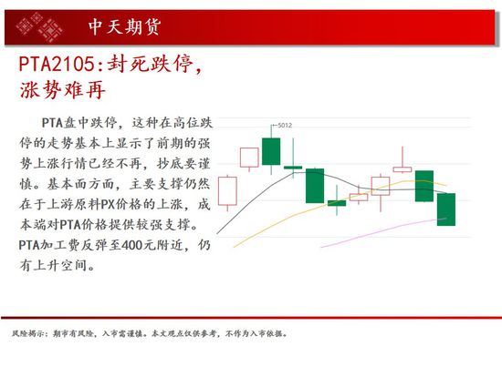 操作建议:PTA盘中跌停,这种在高位跌停的走势基本上显示了前期的强势上涨行情已经不再,抄底要谨慎。