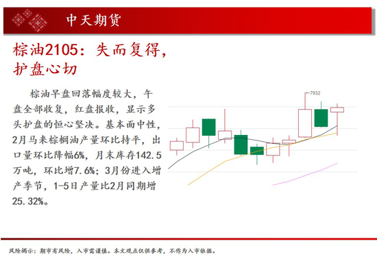 操作建议:棕油早盘回落幅度较大,午盘全部收复,红盘报收,显示多头护盘的恒心坚决。