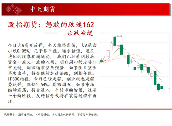 操作建议:今日大A高开反弹,全天维持震荡,大A尾盘小跌0.05%,几乎算平盘。通杀估值,通杀抱团的现象稍稍减弱, 我们已经看到抄底资金一波又一波的入场。明日周四的走势非常关键,周四通常空头强势,如果明日空头再次出手,将会继续加速杀跌,剑指年线。IF300指数,今日已经走强,创业板也是强势反弹,涨幅1.64%。周四周五,如果市场继续震荡;将会进入一个转市的阶段,这是一个新阶段,反转信号或将在震荡过程中出现。