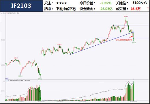 近期指数一直处于回调状态中,弱势明显。受到美债收益率上涨影响,抱团股纷纷遭到抛售,今日抱团继续大跌拖低指数,市场恐慌情绪蔓延。跌破趋势线后,触发空头信号,今日再次跌破关键位延续空头趋势,目前空单可持有。