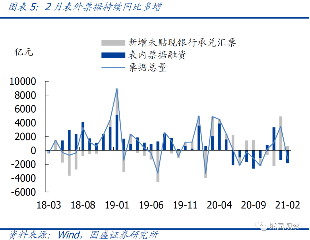 2)表外票据延续超预期。表外融资结构与1月类似,信托贷款延续6个月同比少增,应与信托“两压一降”任务下的融资业务收紧有关。委托贷款延续同比小幅多增。新增未贴现银行承兑汇票再次超预期,较去年同期多增4601亿元。一方面,去年同期疫情冲击企业融资需求,居民出行受限导致尽调开展不便,叠加贴现率下降加速了票据承兑,表外票据减少近4000亿元。基数较低。另一方面,与2018和2019年同期相比,今年2月表外票据仍然多增;且表外加表内的票据总量同比多增2112亿元;再考虑到企业融资的主要工具中长贷也是多增,不需要通过票据来冲量;这些因素整体反映了实体融资需求的旺盛。