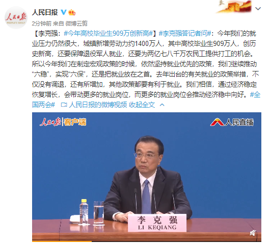 【李克强:#今年高校毕业生909万创新高#】#李克强答记者问#:今年我们的就业压力仍然很大,城镇新增劳动力约1400万人,其中高校毕业生909万人,创历史新高,还要保障退役军人就业,还要为两亿七八千万农民工提供打工的机会。所以今年我们在制定宏观政策的时候,依然坚持就业优先的政策,我们继续推动“六稳”,实现“六保”,还是把就业放在之首。去年出台的有关就业的政策举措,不仅没有调退,还有所增加,其他政策都要有利于就业。我们相信,通过经济稳定恢复增长,会带动更多的就业岗位,而更多的就业岗位会推动经济稳中向好。#全国两会#