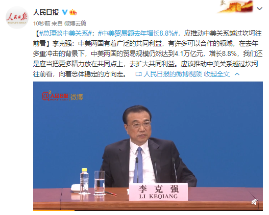 【#总理谈中美关系#:#中美贸易额去年增长8.8%#,应推动中美关系越过坎坷往前看】李克强:中美两国有着广泛的共同利益,有许多可以合作的领域。在去年多重冲击的背景下,中美两国的贸易规模仍然达到4.1万亿元,增长8.8%,我们还是应当把更多精力放在共同点上,去扩大共同利益。应该推动中美关系越过坎坷往前看,向着总体稳定的方向走。