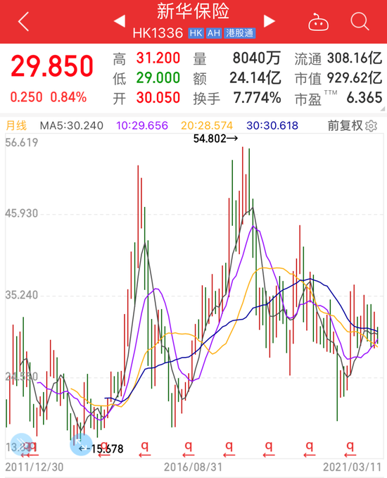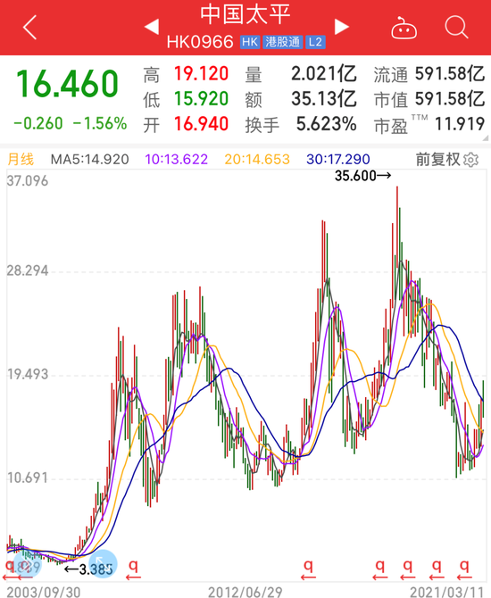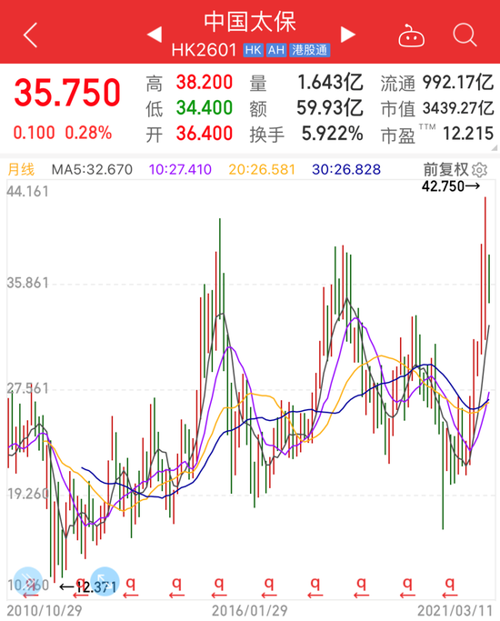 太保集团港股市值3439亿港元,是A股市值的70%。市盈率不错,高达12倍,比平安还高,股价涨跌有序,股价时涨时跌,不温不火。