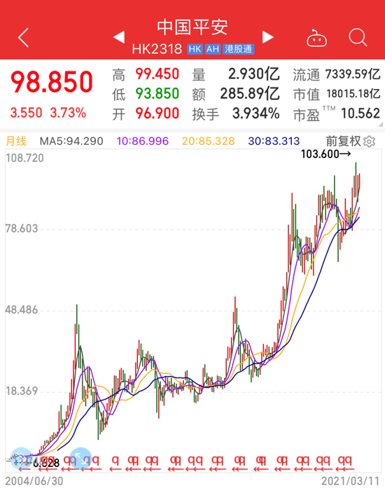 中国平安自在香港上市以来,股价一路飙升,股价上涨十多倍,市值18117亿港元,与A股基本相当。