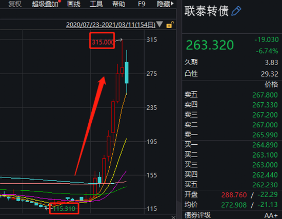 另一“妖债”联泰转债则在不到10个交易日内,从120多元暴涨至250元以上,走出一条陡直的K线,并多次触及临停,至3月10日,价格一度涨至315元。