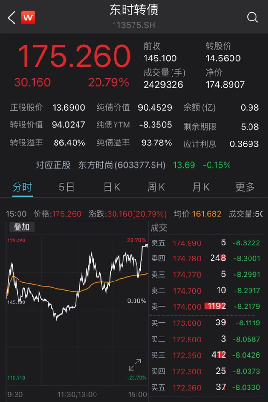 除此之外,东时转债尾盘涨幅触及20%临停,收盘时涨20.79%,报175.26元。转股溢价率升至86.40%。