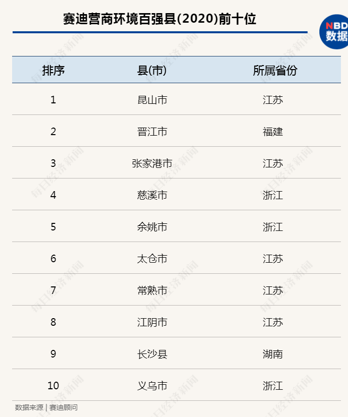 赛迪公布的2020营商环境百强县前十位,江苏、浙江占据八席