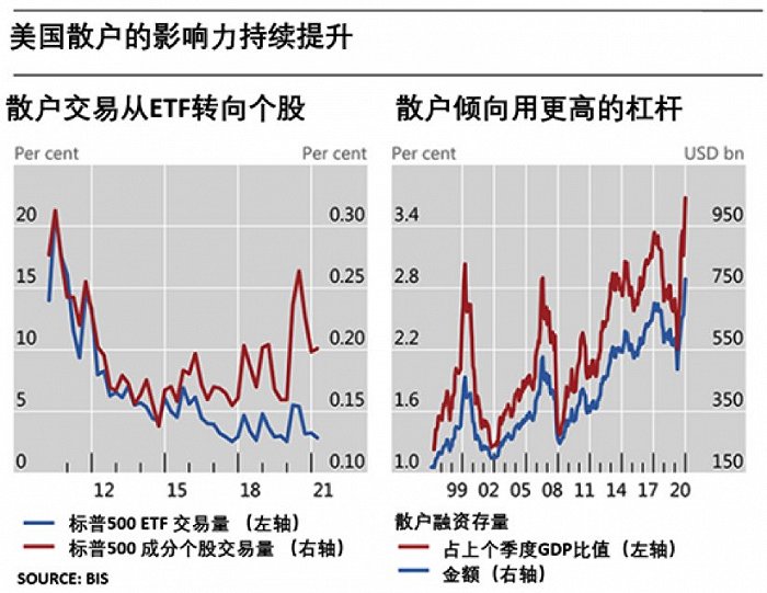 国际清算银行(BIS)在3月初发布的报告显示,疫情以来美国散户交易活动正从ETF指数越来越转向个股,且散户融资金额近期也创下了历史新高。报告称,散户投资者对市场的影响力正在持续提升。