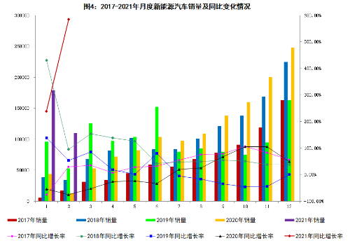 1-2月,新能源汽车产销分别完成31.7万辆和28.9万辆,同比分别增长3.9倍和3.2倍。分车型看,纯电动汽车产销分别完成27.3万辆和24.3万辆,同比分别增长4.6倍和3.6倍;插电式混合动力汽车产销分别完成4.4万辆和4.6万辆,同比分别增长1.7倍和1.8倍;燃料电池汽车产销分别完成59辆和91辆,同比分别下降59.3%和46.8%。