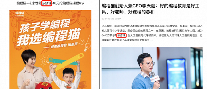 这也成为众多编程教育机构手中的宣传利器。例如“编程猫”就在许多宣传语种带上“必修”等字眼。
