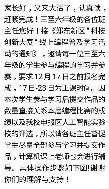 2020年末,曾有“编程猫遭郑州家长举报:班主任强行摊派课程”的相关报道,再次将编程猫推向了风口浪尖。相关报道显示,一份貌似是教育局或学校的通知,让河南郑州郑东新区的公立小学的班主任发到班级群里。通知中要求每一位三到六年级的学生参与编程的学习,并立即完成“科技线上大赛”的报名。据报道指出,当家长按提示扫码后,竟进入编程猫相关页面。