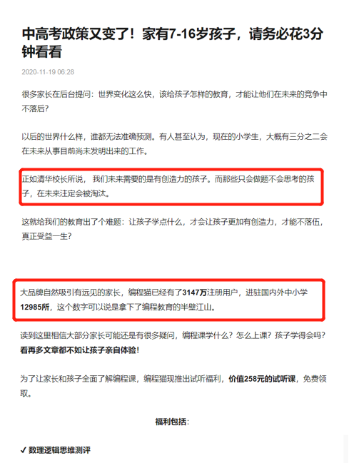 而在投放宣传上,制造焦虑的问题依然屡禁不止。一篇发布于2020年11月的文章,题为《中高考政策又变了!家有7-16岁孩子,请务必花3分钟看看》,文章开头引用“清华校长”的话称“我们未来需要的是有创造力的孩子。而那些只会做题不会思考的孩子,在未来注定会被淘汰。”可文章的后半部分,却在为编程猫打广告。