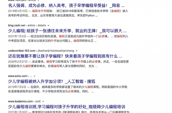 在搜索引擎中以“编程”为关键词,可以搜索到大量的宣传帖,虽然具体表述不同,但总体阐述的核心观点都是围绕在“编程将纳入中高考”、“学编程有利于优先录取”、“编程是未来的必修科目”、“不会编程无法毕业”等观点展开。